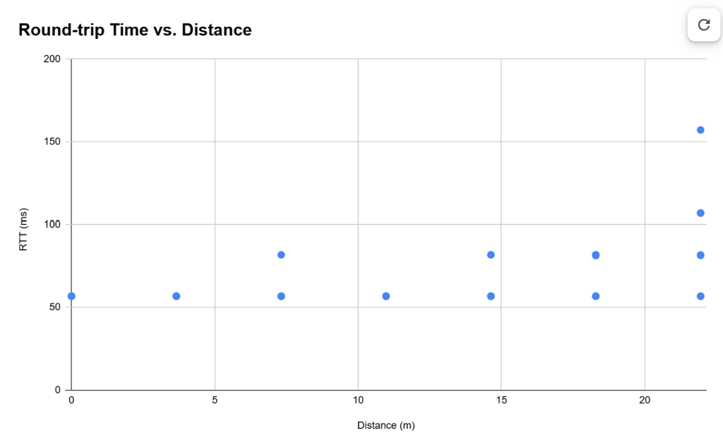 Measured ESP32 to STM32 communication delay by logging timestamps when packets were sent and when they were received, then plotting the round-trip time across varying distances. Findings showed that at increasing data ranges, RTT would experience latency spikes, leading us to slightly refine packet size and filtering to keep end-to-end delay within requirements.