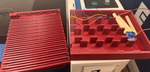 This week I cut hundreds of dowels. I still need to cut more when the other dowels come in. This week I also successfully wrote the firmware to control 3 servo motors on the PWM expanders and 2 stepper motors. I was originally having issues with the PWM expander, but the issue was that I forgot to plug it into a power source. When I first flashed the code onto the STM, the stepper motor twitched. This was due to the step pulses being too fast. I then added the stepper motor code but the stepper motors just did not spin. I tried to debug this by unplugging the I2C PWM expander, but the stepper motor started twitching again. This was because with no I2C devices connected, the I2C reader was failing and was blocking for a short period of time. This made the stepping loop slower, allowing the motor to spin. When I reduced the timeout, the stepper pulses became fast again, causing the motor to twitch. So increasing the I2C blocking period was just slowed down the CPU to make the stepping speed possible. The second stepper motor also initially used illegal GPIO pins.