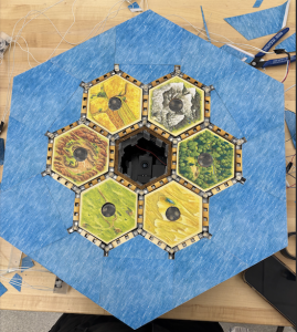 Finally, we also finished the visual design: gluing down the printed resource images on each tile and adding the blue water background to make the board match the real Catan aesthetic.